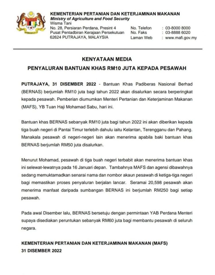 Berita baik buat pesawah di seluruh Malaysia! Bantuan Khas Padiberas Nasional Berhad (BERNAS) berjumlah RM10 juta bagi tahun 2022 akan disalurkan secara berperingkat kepada pesawah. Pemberian diumumkan Menteri Pertanian dan Keterjaminan Makanan (MAFS), YB Tuan Haji Mohamad Sabu.