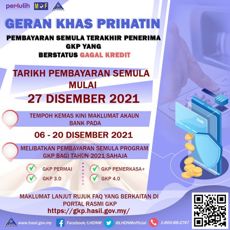 Lembaga Hasil Dalam Negeri (LHDN) telah memaklumkan penerima Geran Khas Prihatin (GKP) sebelum ini yang berstatus GAGAL KREDIT akan menerima bayaran terakhir masing-masing pada bulan Disember ini. Pembayaran semula ini juga melibatkan individu yang telah mengemaskini akaun bank sebelum ini.