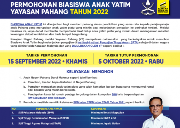 Yayasan Pahang mempelawa calon-calon yang berkelayakan untuk memohon Biasiswa Anak Yatim bagi melanjutkan pengajian di Institusi-Institusi Pengajian Tinggi Awam (IPTA) dalam negara.