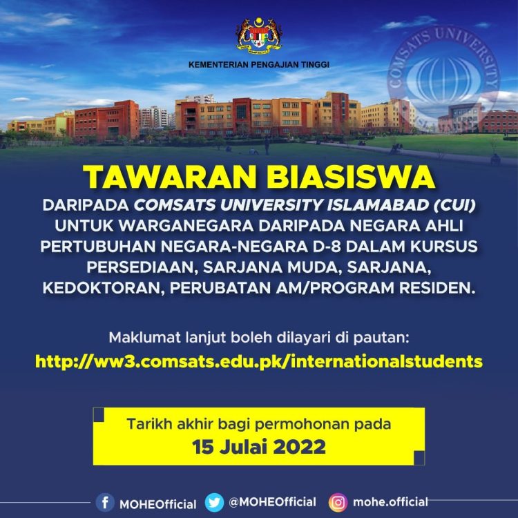 Kementerian Pengajian Tinggi (KPT) menyeru pelajar-pelajar di Malaysia yang sedang mengikuti pengajian tinggi dan sedang mencari tajaan biasiswa bersesuaian memohon biasiswa daripada University Islamabad COMSATS yang dibuka untuk warganegara daripada negeri ahli Pertubuhan Negara-Negara D-8.