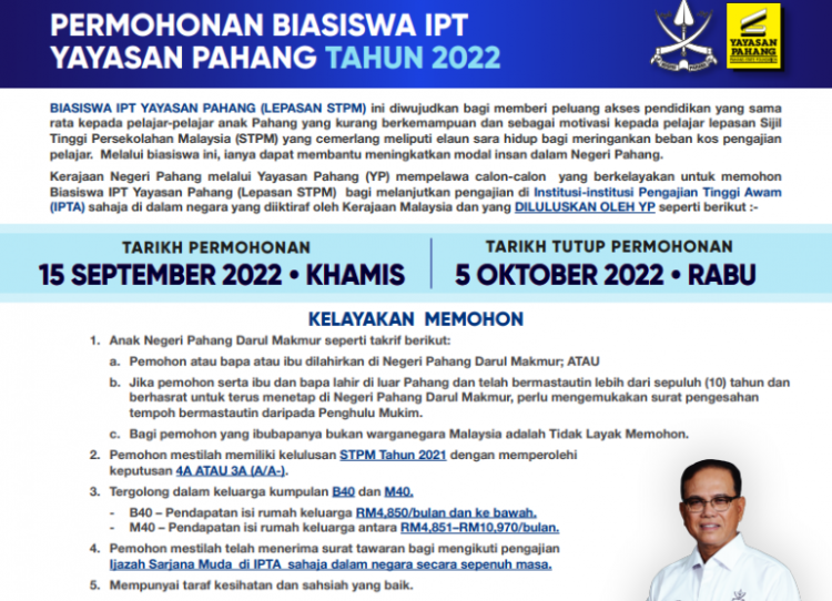Kerajaan negeri Pahang melalui yayasan Pahang (YP) mempelawa calon-calon yang berkelayakan untuk memohon Biasiswa IPT Yayasan Pahang (Lepasan STPM) bagi melanjutkan pengajian di Institusi-Institusi Tinggi Awam (IPTA) dalam negara.