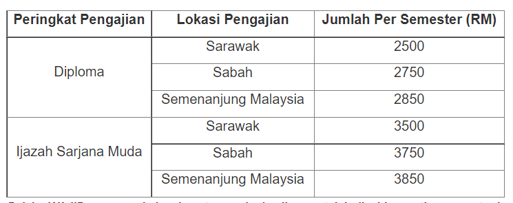 Kadar pembiayaan Biasiswa Pinjaman Kerajaan Negeri Sarawak adalah seperti berikut: