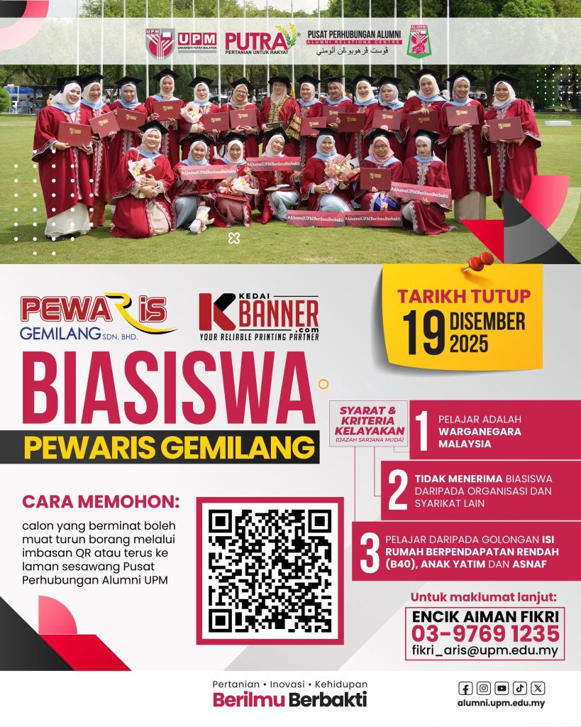 Biasiswa adalah antara bantuan penting yang membantu pelajar meringankan beban kewangan sepanjang pengajian. Pada tahun 2025, Universiti Putra Malaysia (UPM) melalui Pusat Perhubungan Alumni menawarkan Biasiswa Pewaris Gemilang, sebuah inisiatif khas untuk membantu pelajar yang memerlukan sokongan kewangan bagi meneruskan pengajian dengan lebih stabil dan teratur. Program ini memberi fokus kepada golongan pelajar berpendapatan rendah, sekali gus memastikan mereka tidak tercicir dalam proses pendidikan.