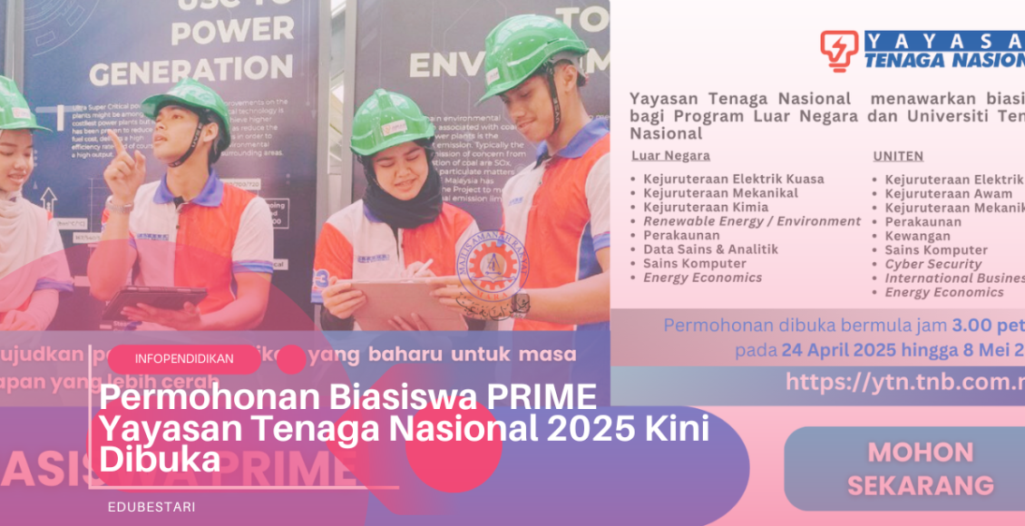 Bagi pelajar lepasan SPM 2024 yang bercita-cita besar dan berpotensi tinggi, Biasiswa PRIME 2025 oleh Yayasan Tenaga Nasional (YTN) kini membuka ruang untuk merealisasikan impian anda. Ditawarkan kepada pelajar terbaik negara, biasiswa ini menyokong pengajian di institusi pengajian tinggi luar negara serta di Universiti Tenaga Nasional (UNITEN), salah satu universiti swasta terkemuka Malaysia dalam bidang kejuruteraan, teknologi dan tenaga.