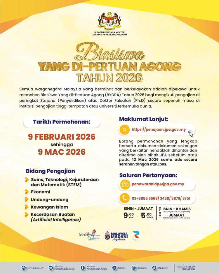Biasiswa Yang di-Pertuan Agong (BYDPA) merupakan antara biasiswa paling berprestij di Malaysia, ditawarkan kepada warganegara yang cemerlang dari segi akademik, kepimpinan dan potensi sumbangan kepada negara. Bagi tahun 2026, peluang ini sekali lagi dibuka kepada calon terbaik yang berhasrat melanjutkan pengajian di peringkat Sarjana (Penyelidikan) dan Doktor Falsafah (PhD) secara sepenuh masa.