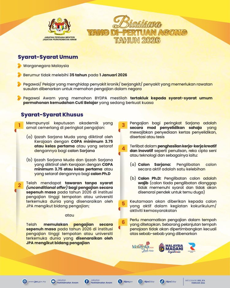 Biasiswa Yang di-Pertuan Agong (BYDPA) 2026 bukan sekadar tajaan pengajian, tetapi satu pengiktirafan tertinggi negara kepada bakat intelektual terbaik Malaysia. Dengan syarat yang ketat dan persaingan yang sangat tinggi, hanya calon yang benar-benar cemerlang, berwawasan dan berjiwa kepimpinan akan terpilih.