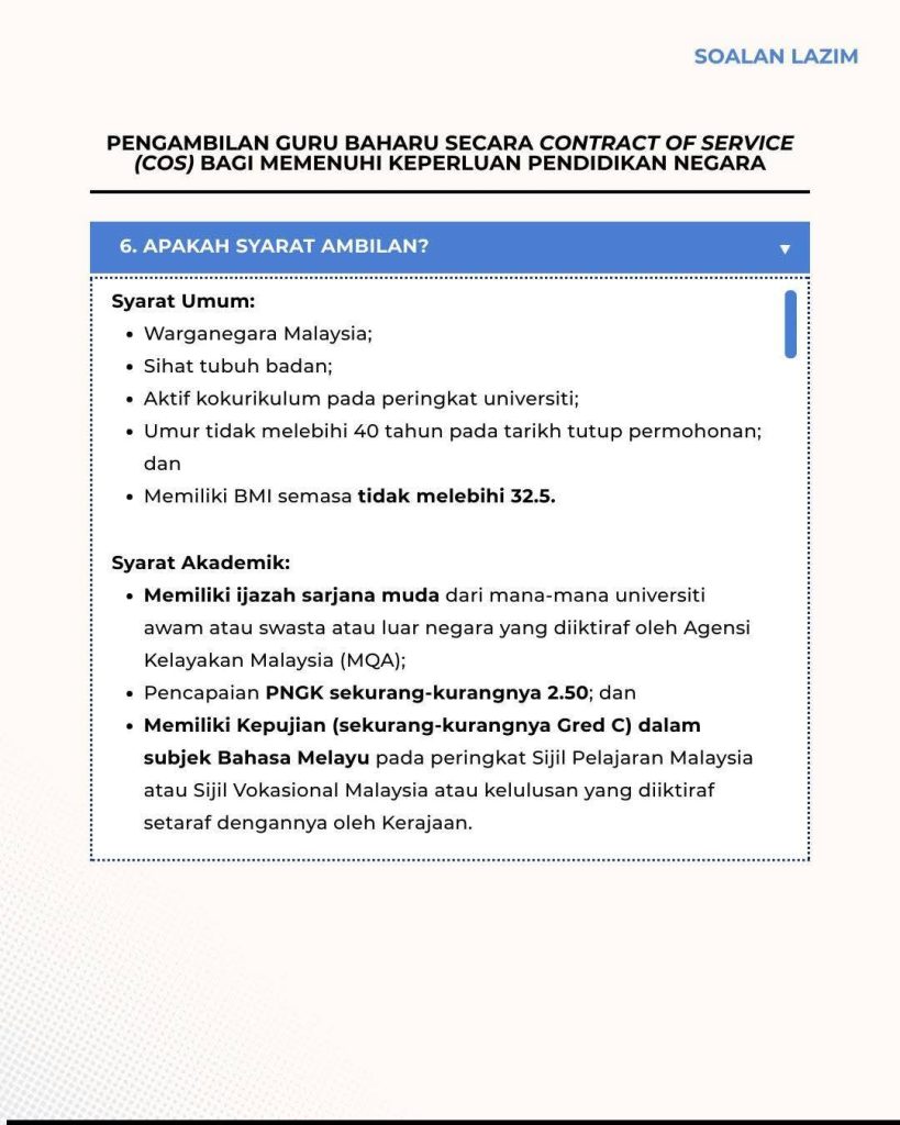 Ramai calon yang ingin memohon sebagai Guru Contract of Service (CoS) KPM 2026 terkejut apabila mengetahui bahawa BMI (Body Mass Index) turut menjadi salah satu perkara yang dinilai dalam proses saringan awal. Ada yang mempersoalkan mengapa ukuran berat dan tinggi badan perlu diambil kira sedangkan tugas guru lebih tertumpu kepada pengajaran dan pembelajaran di dalam kelas.