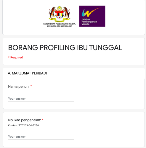 Kementerian Pembangunan Wanita, Keluarga dan Masyarakat mengucapkan terima kasih yang tidak terhingga kepada Ibu Tunggal yang sudi meluangkan masa mengisi borang profilling ini. Semoga dengan maklumat ini, pihak Kementerian dapat mengatur gerak tindakan yang lebih sistematik dan berkesan bagi membantu memperkasakan ibu tunggal. Justeru, maklumat yang diberikan perlu tepat dan jelas.