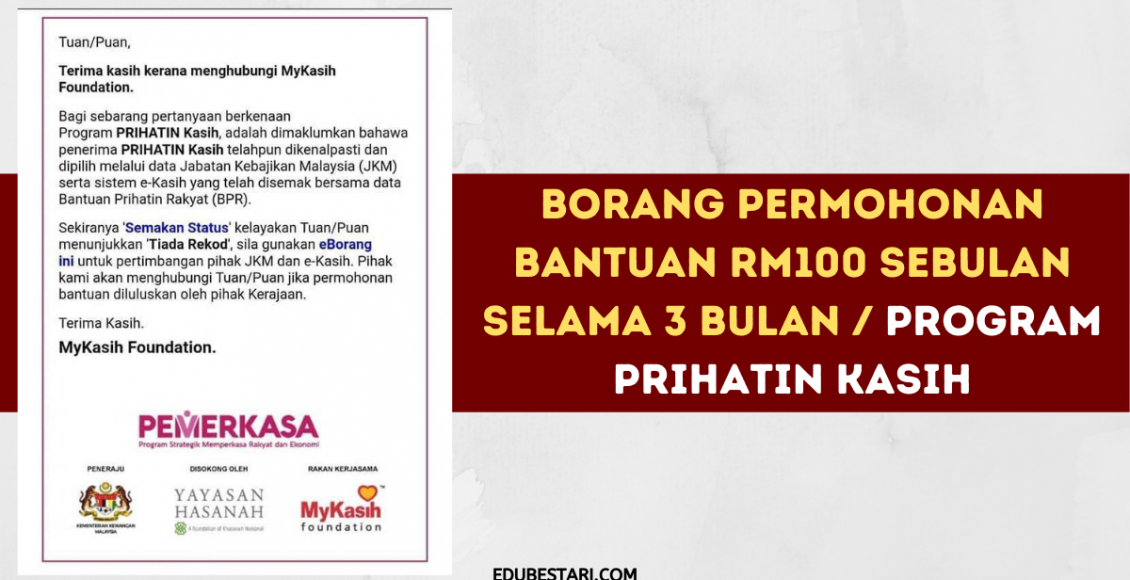 Bagi sebarang pertanyaan berkenaan Program PRIHATIN Kasih, adalah dimaklumkan bahawa penerima PRIHATIN Kasih telahpun dikenalpasti dan dipilih melalui data Jabatan Kebajikan Malaysia (JKM) serta sistem e-Kasih yang telah disemak bersama data Bantuan Prihatin Rakyat (BPR).