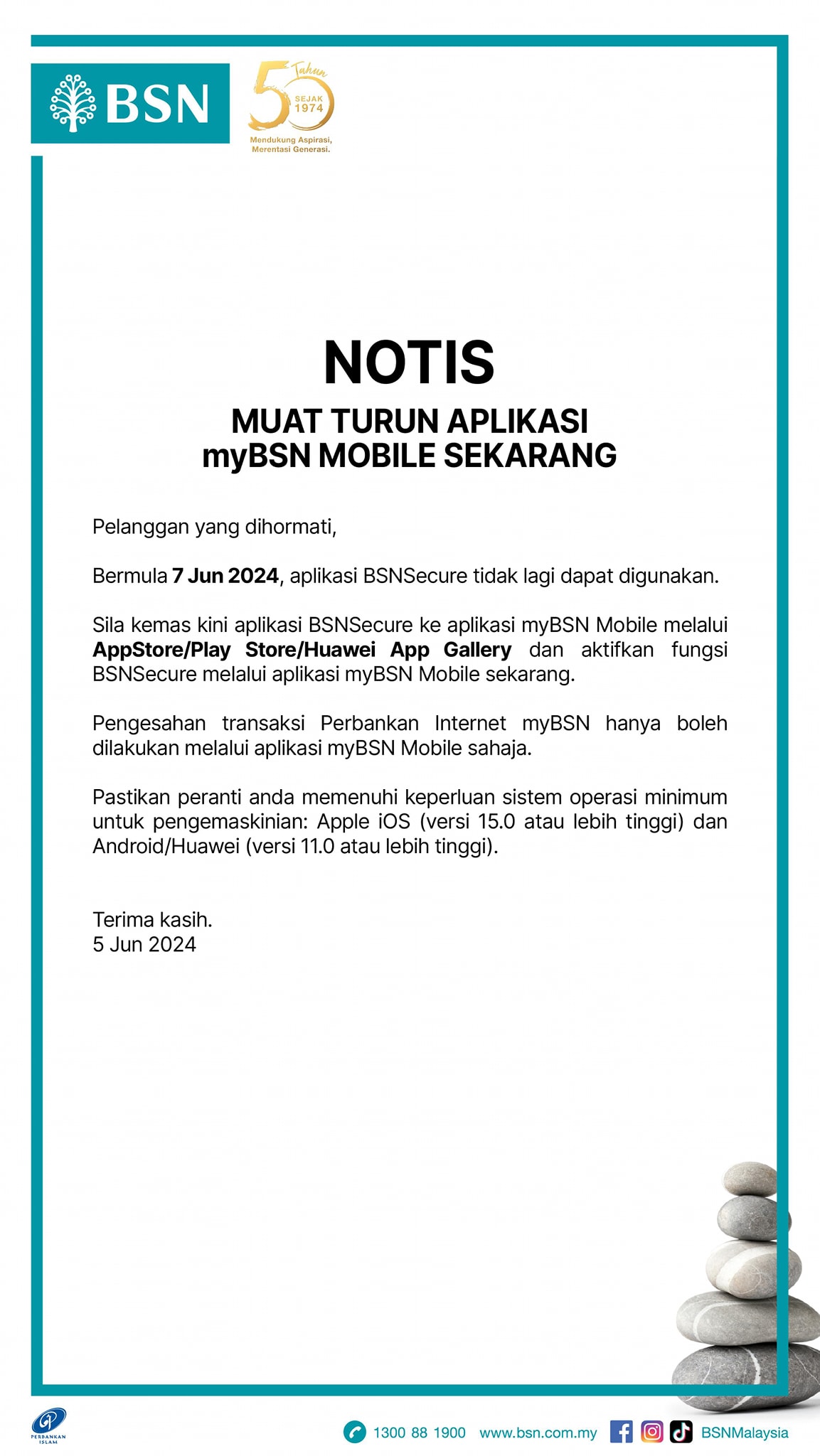 Bank Simpanan Nasional (BSN) Malaysia memaklumkan bahawa aplikasi BSNSecure tidak lagi dapat digunakan bermula 7 Jun 2024. Peralihan ini adalah sebahagian daripada usaha BSN untuk meningkatkan pengalaman dan keselamatan pengguna.