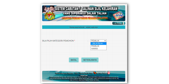 - Pengguna perlu memilih kategori permohonan sebagai pemilik atau waris.