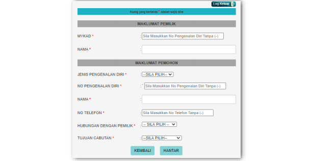- Jika pengguna memilih kategori sebagai “Pemilik”, sila lengkapkan borang permohonan tersebut.