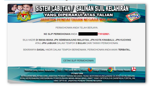 - Berikut adalah paparan bagi permohonan yang berjaya didaftarkan, sila klik butang Cetak Slip Permohonan.