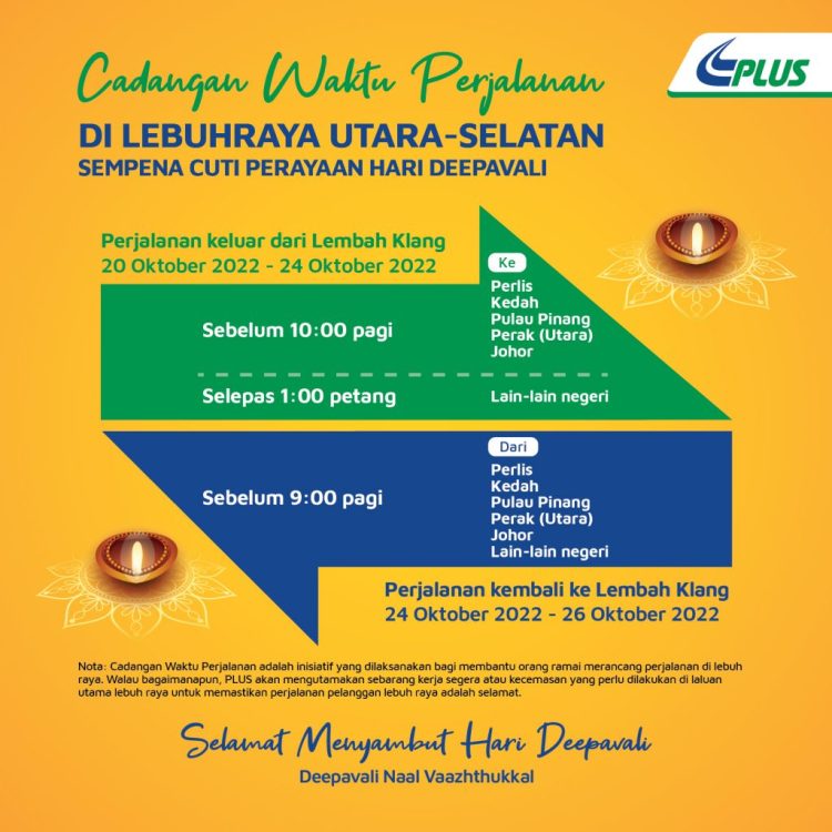 Ikuti perkongsian di bawah untuk maklumat cuti sempena perayaan Hari Deepavali dan cadangan waktu perjalanan yang dikeluarkan oleh PLUS.