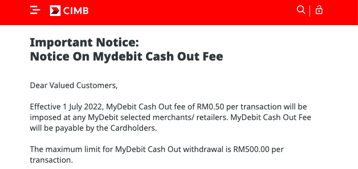 Tak lama lagi, beberapa institusi bank di Malaysia akan mengenakan caj perkhidmatan sebanyak RM0.50 sen bagi setiap urusan MyDebit Cash Out!