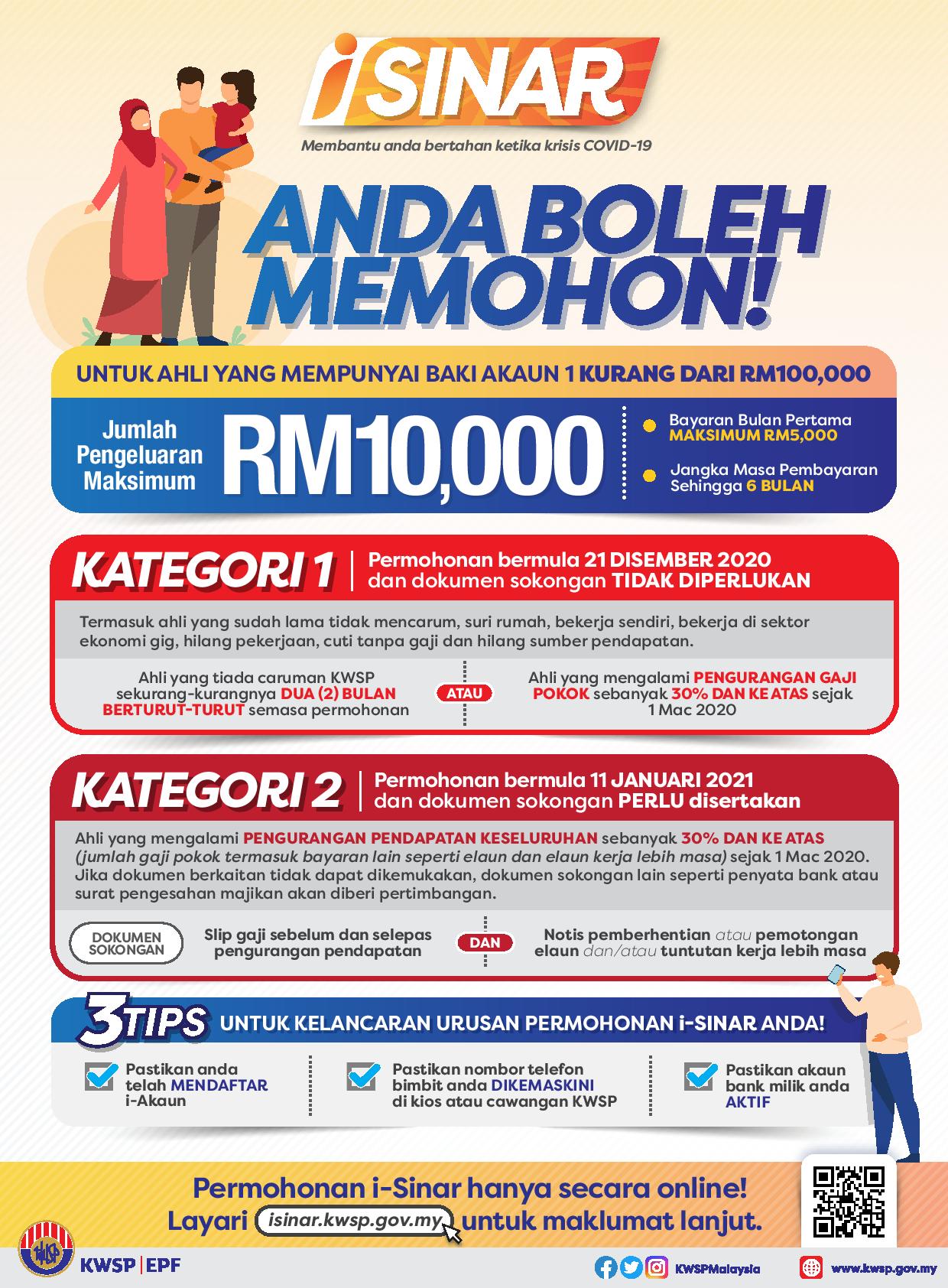 Bagi kategori ini, ahli boleh memohon secara dalam talian melalui isinar.kwsp.gov.my mulai 11 Januari 2021.