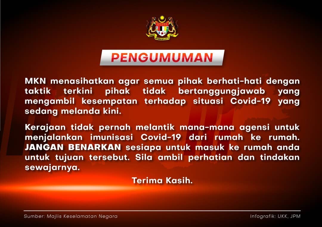 Majlis Keselamatan Negara (MKN) menasihatkan agar semua pihak berhati-hati dengan taktik terkini pihak tidak bertanggungjawab yang mengambil kesempatan terhadap situasi Covid-19 yang sedang melanda.