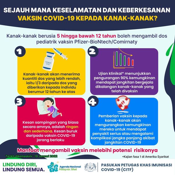 Untuk makluman anda, kerajaan akan memulakan Program Imunisasi Covid-19 bagi kanak-kanak 5 hingga bawah 12 tahun bermula Februari 2022. Setakat ini hanya dos pediatrik vaksin Pfizer- BioNTech/ Corminaty yang telah diluluskan untuk kanak-kanak kategori umur ini. Ianya telah dibuktikan selamat dan berkesan.