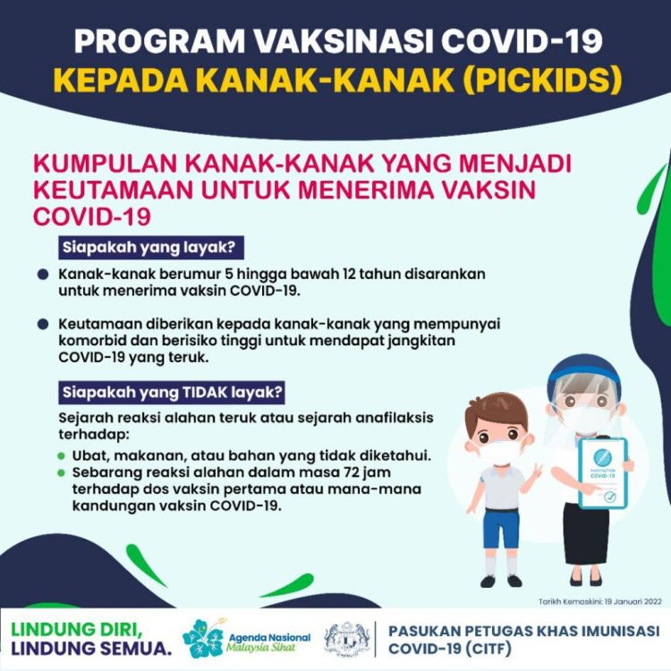 Oleh itu, ibu bapa yang nak daftarkan anak untuk pemberian vaksin Covid-19 dan boleh buat pendaftaran melalui MySejahtera di bawah program PICKIDS. Walaupun pemberian vaksin kepada golongan ini tidak diwajibkan, ibu bapa digalakkan untuk mendaftarkan anak masing-masing demi melindungi mereka daripada Covid-19.
