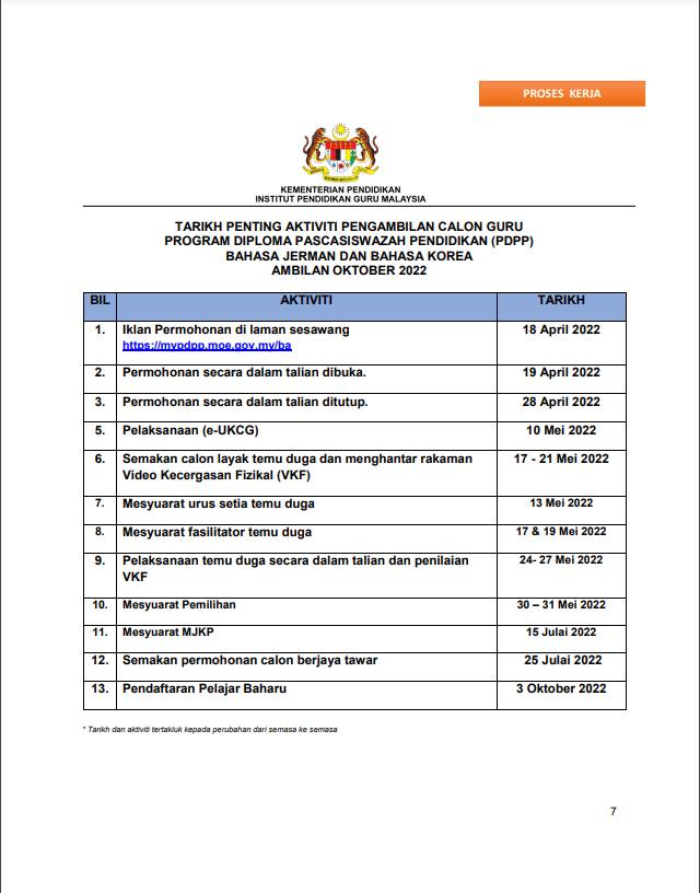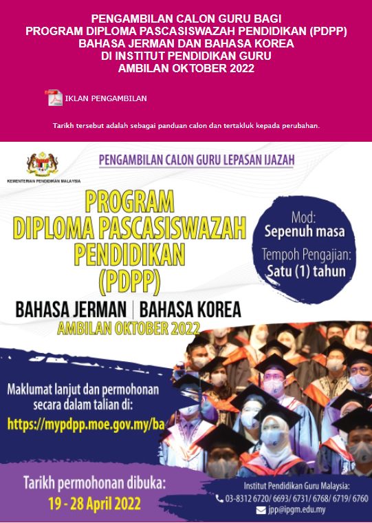 Kementerian Pendidikan Malaysia (KPM) mempelawa calon yang berkelayakan berpotensi, berminat dan beriltizam untuk memohon Program Diploma Pascasiswazah Pendidikan (PDPP) Bahasa Jerman dan Bahasa Korea di Institusi Pendidikan Guru ambilan Oktober 2022.