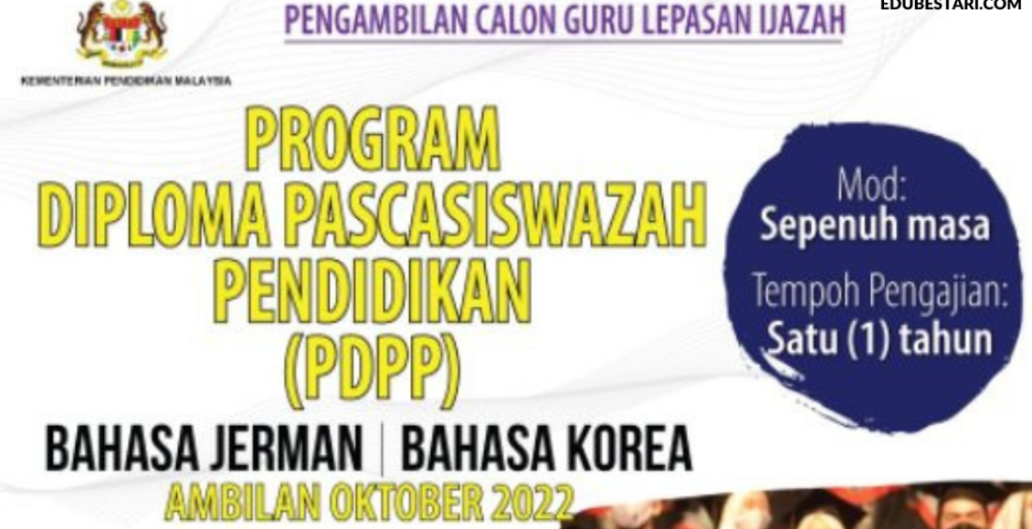 Kementerian Pendidikan Malaysia (KPM) mempelawa calon yang berkelayakan berpotensi, berminat dan beriltizam untuk memohon Program Diploma Pascasiswazah Pendidikan (PDPP) Bahasa Jerman dan Bahasa Korea di Institusi Pendidikan Guru ambilan Oktober 2022.