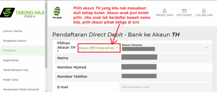 - Pilih Akaun TH yang anda nak masukkan duit setiap bulan. Akaun anak pun boleh.