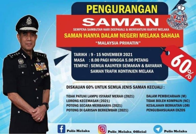 Berita baik buat rakyat negeri Melaka! Sempena dengan sambutan Hari Deepavali dan ingin menyantuni rakyat negeri Melaka, Polis DiRaja Malaysia (PDRM) Melaka ingin menawarkan diskaun saman trafik sehingga 60% bagi pelbagai jenis saman!