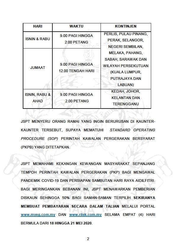 Jabatan Siasatan dan Penguatkuasaan Trafik (JSPT) melancar kempen bayaran saman secara ‘e-payment’ bermula 18 Mei hingga 21 Mei ini, dengan pemberian diskaun sebanyak 50 peratus bersempena Peringatan Hari Polis ke-2.