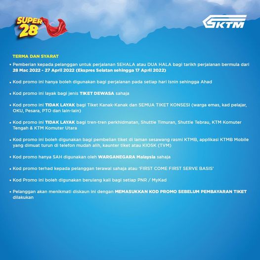 Tawaran diskaun SUPER28 KTMB adalah bagi perjalanansepanjang tempoh berikut sahaja: