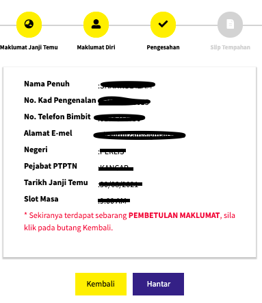 - Dah sahkan maklumat, klik Hantar. Cetak Slip tempahan anda untuk dibawa ke kaunter PTPTN nanti
