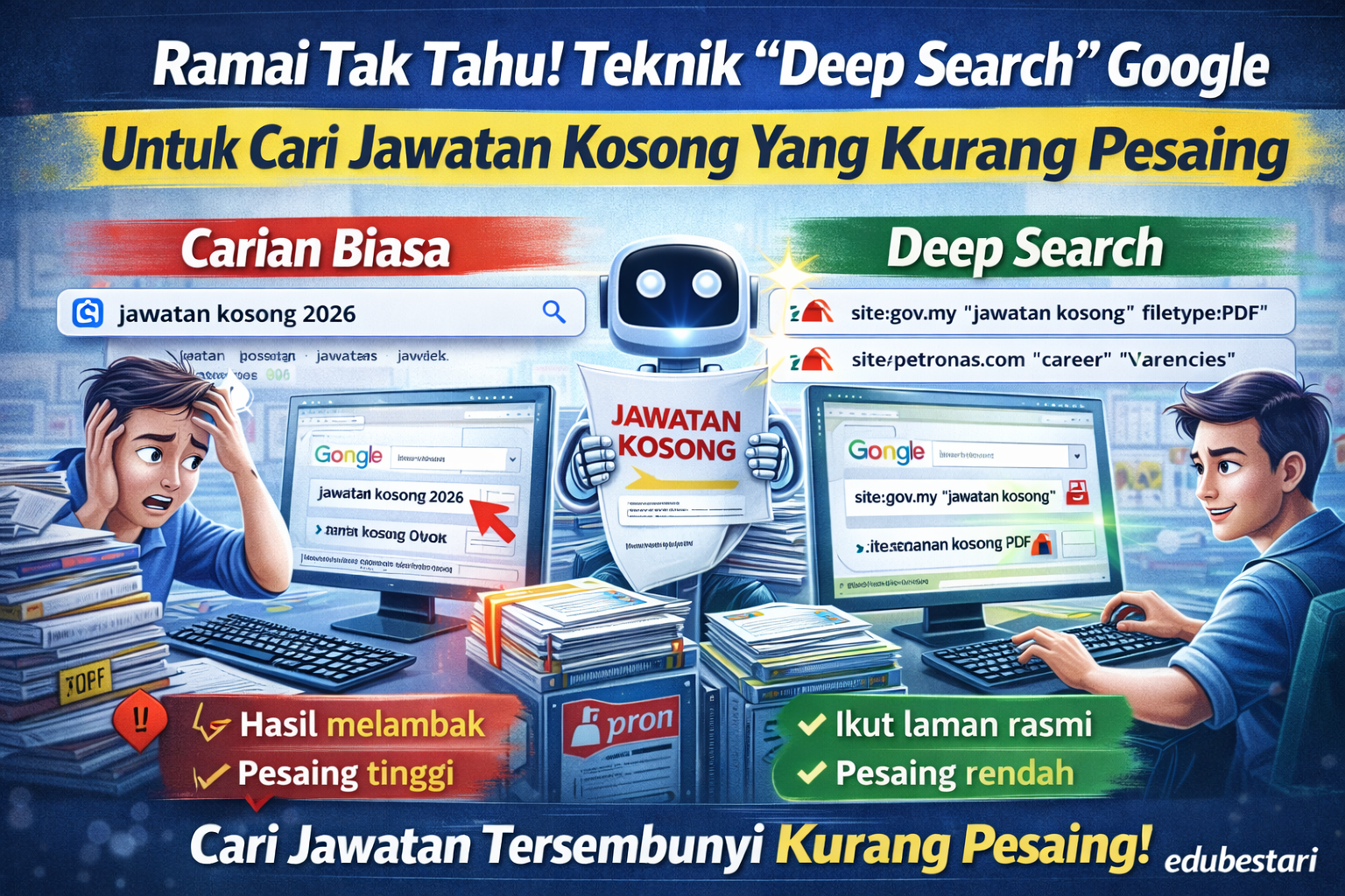 Calon yang hanya menaip “jawatan kosong 2026” di Google berisiko terlepas peluang penting. Sebaliknya, calon yang menggunakan teknik Deep Search (Carian Mendalam) mempunyai kelebihan besar kerana mereka mampu menemui iklan rasmi yang kurang pesaing dan lebih sahih.