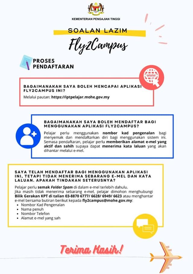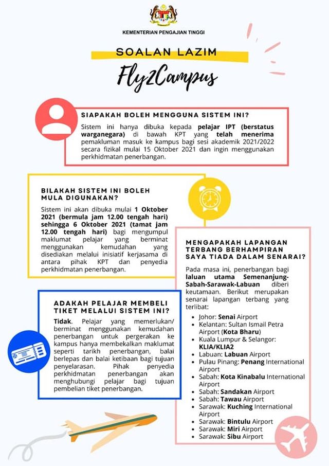 Sukacita dimaklumkan bahawa pihak Kementerian Pendidikan Tinggi telah memperkenalkan sistem Fly2Campus yang merupakan satu inisiatif untuk membantu pelajar dalam pergerakan untuk kembali ke kampus.