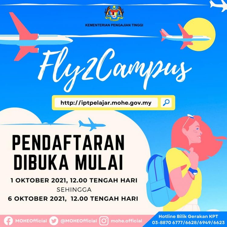 - Aplikasi Fly2Campus boleh diakses bermula 1 Oktober 2021 di https://iptpelajar.mohe.gov.my/
