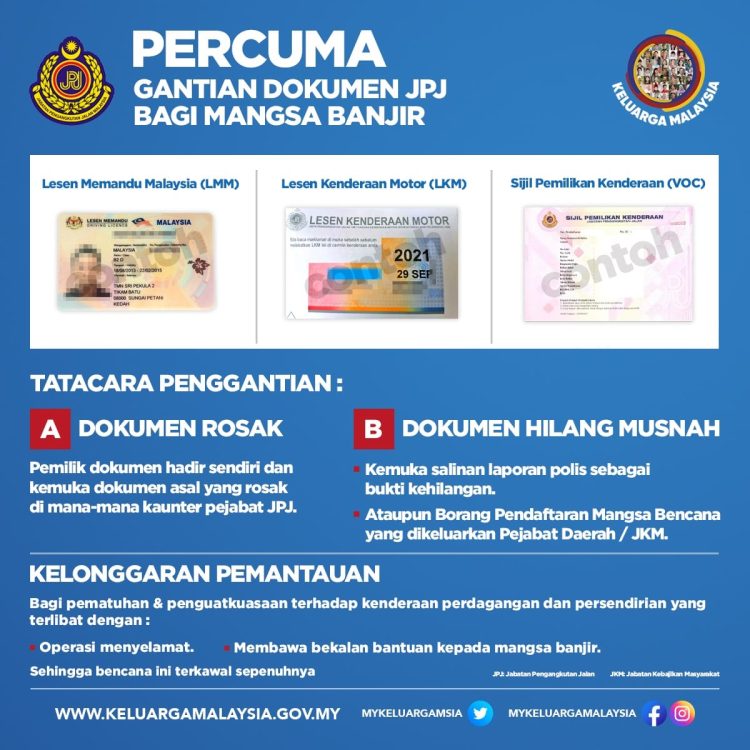 Mangsa banjir yang kehilangan atau kerosakan dokumen penting JPJ seperti berikut layak mendapatkan gantian percuma: