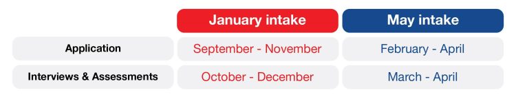 Untuk makluman anda, permohonan boleh dibuat sepanjang tahun. Pengambilan calon adalah pada Januari dan Mei setiap tahun. Hanya calon yang disenarai pendek sahaja akan dihubungi untuk temuduga.