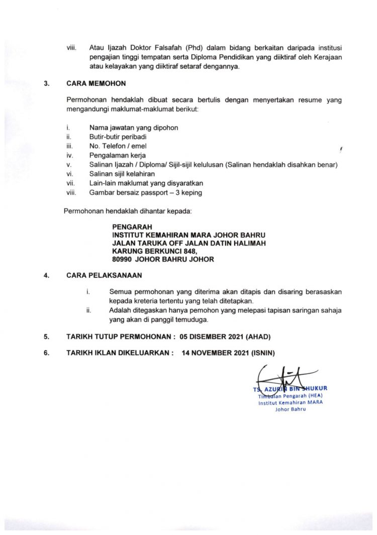 - Tarikh tutup permohonan: 5 Disember 2021 (Ahad)