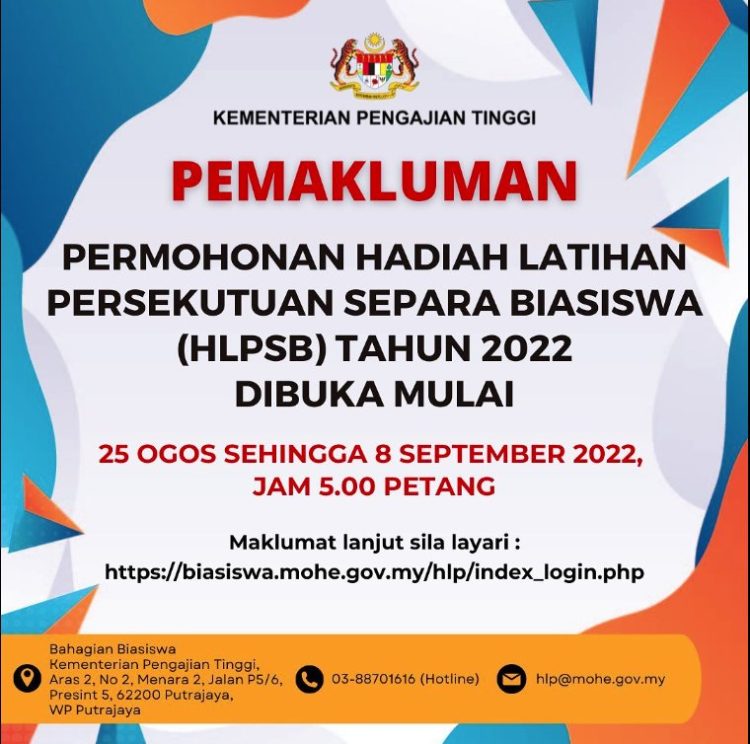 Kementerian Pengajian Tinggi menawarkan penajaan skim Hadiah Latihan Persekutuan (HLP) Separa Biasiswa (SB) kepada Pegawai Kumpulan Pengurusan dan Profesional di dalam skim perkhidmatan Pegawai Pendidikan Pengajian Tinggi (PPPT) di Politeknik, Kolej Komuniti dan Kementerian Pengajian Tinggi yang sedang mengikuti pengajian secara SEPARUH MASA di peringkat Sarjana dan Ph.D di Institusi Pengajian Tinggi Awam di Dalam Negara.
