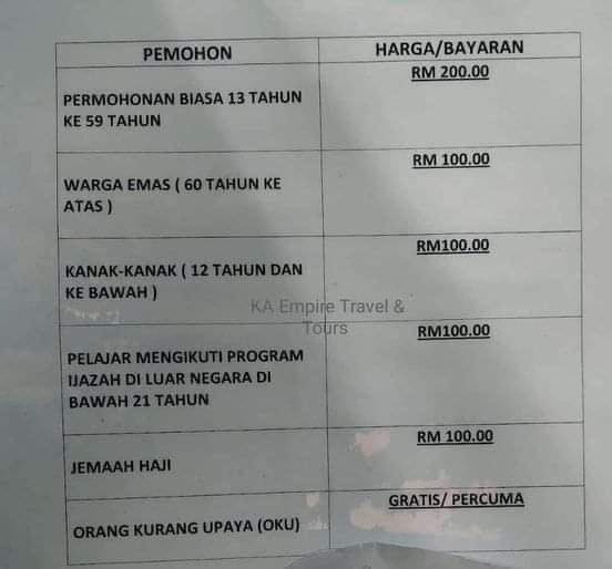 Berikut adalah harga terkini renew atau perbaharui passport Malaysia: