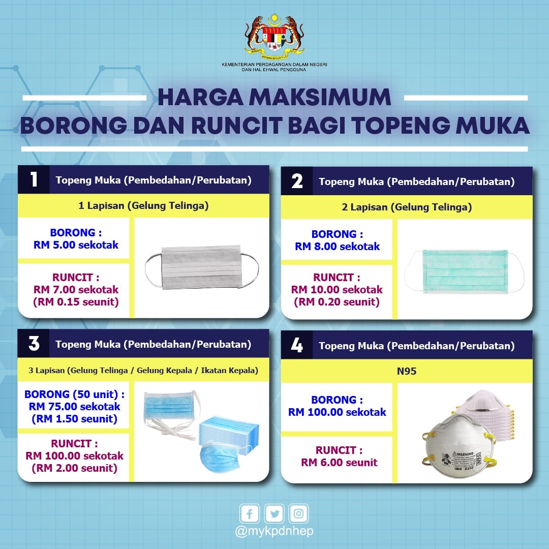 KPDNHEP juga mengingatkan peniaga bahawa topeng muka (pembedahan/perubatan) N95 dijual pada harga borong sebanyak RM 100.00 sekotak, harga runcit adalah sebanyak RM 6.00 seunit