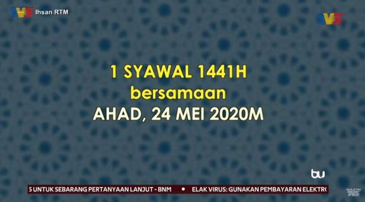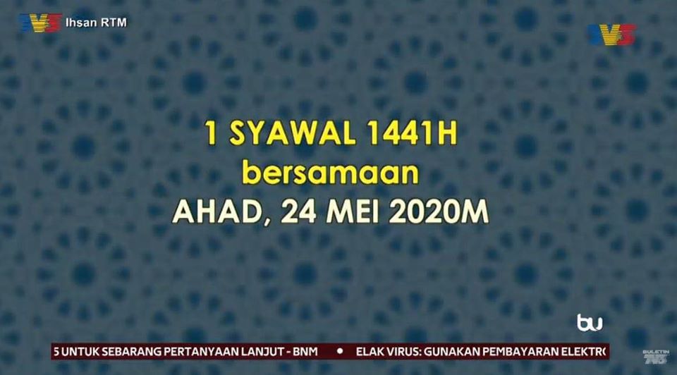 “Bagi menyempurnakan titah perintah Ke Bawah Duli Yang Maha Mulia Seri Paduka Baginda Yang di-Pertuan Agong, setelah diperkenankan oleh Duli-Duli Yang Maha Mulia Raja-Raja, maka adalah dengan ini saya mengisytiharkan bahawa tarikh Hari Raya Puasa bagi negeri-negeri seluruh Malaysia ialah pada hari Ahad, 24 Mei 2020,” katanya.