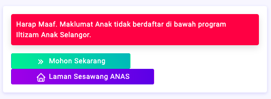 - Jika maklumat anak tidak berdaftar di bawah program Iltizam Anak Selangor, anda boleh mula buat pendaftaran sekarang dengan klik Mohon Sekarang