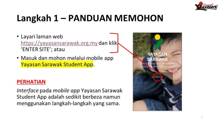 - Menggunakan mobile app Yayasan Sarawak Student App