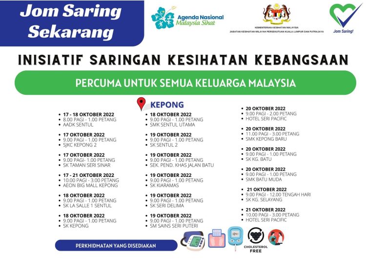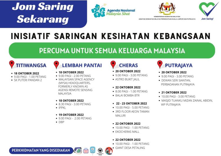 Buat orang ramai yang tinggal di sekitar Kuala Lumpur & Putrajaya, anda dipelawa untuk dapatkan inisiatif saringan kesihatan kebangsaan percuma pada: