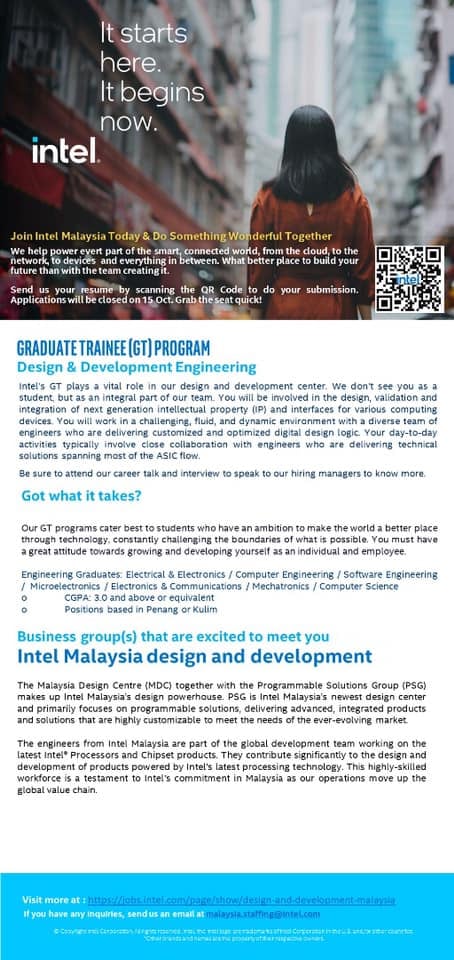 Intel Corporation, sebuah perbadanan multinasional yang berpusat di Amerika Syarikat dan terkenal dengan rancangan dan penghasilan mikropemproses dan mengkhususkan dalam litar bersepadu mempelawa graduan yang berminat dan berkelayakan mengikuti Graduate Trainee Program yang ditawarkan.