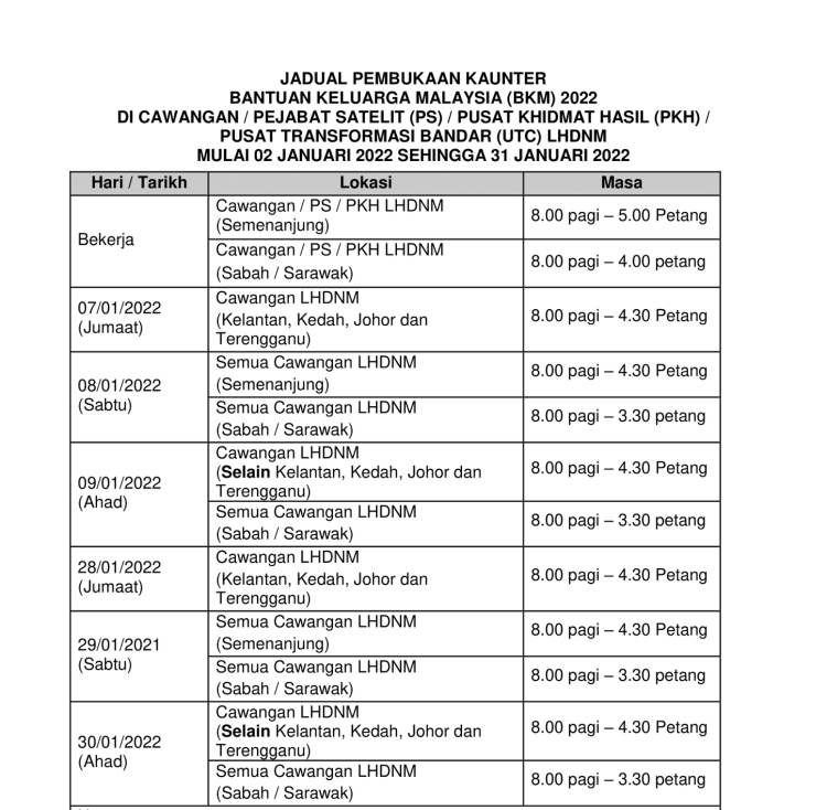 • Bagi Kaunter BKM 2022 yang tidak beroperasi pada tarikh di atas, notis pada umum akan dipamerkan pada premis berkenaan