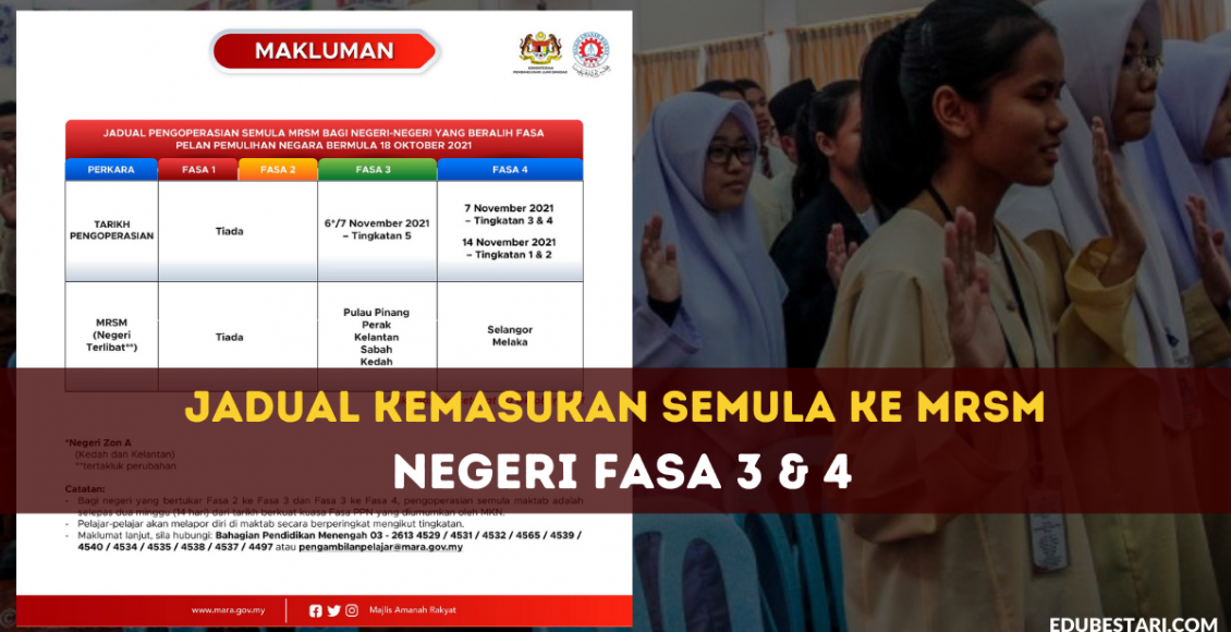 Untuk makluman anda, tarikh kemasukan semula pelajar ke MRSM adalah secara berperingkat dan mengikut fasa Pelan Pemulihan Negara (PPN) di setiap negeri. Memandangkan ada beberapa negeri sudah bertukar ke fasa 3 dan 4, ibu bapa diminta ambil perhatian tarikh terkini kemasukan semua ke sekolah bagi setiap negeri.
