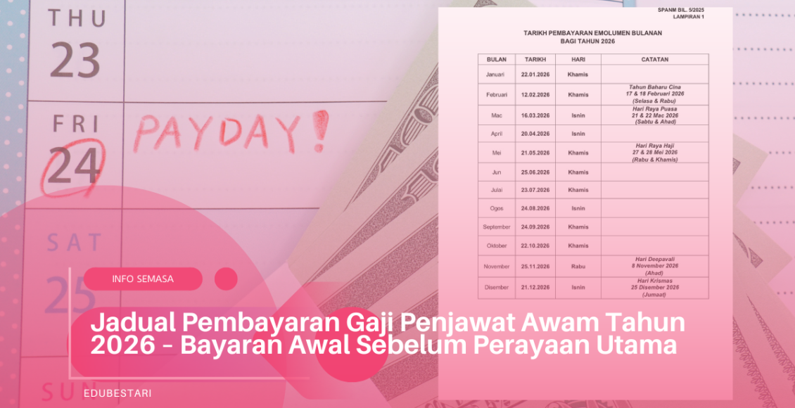 Kabar gembira buat semua penjawat awam! Jadual rasmi Tarikh Pembayaran Emolumen Bulanan bagi Tahun 2026 telah diumumkan oleh Jabatan Akauntan Negara Malaysia (JANM) melalui Surat Pekeliling Akauntan Negara Malaysia Bil. 5/2025. Jadual ini menetapkan tarikh pembayaran gaji bulanan bagi penjawat awam di seluruh negara sepanjang tahun 2026.
