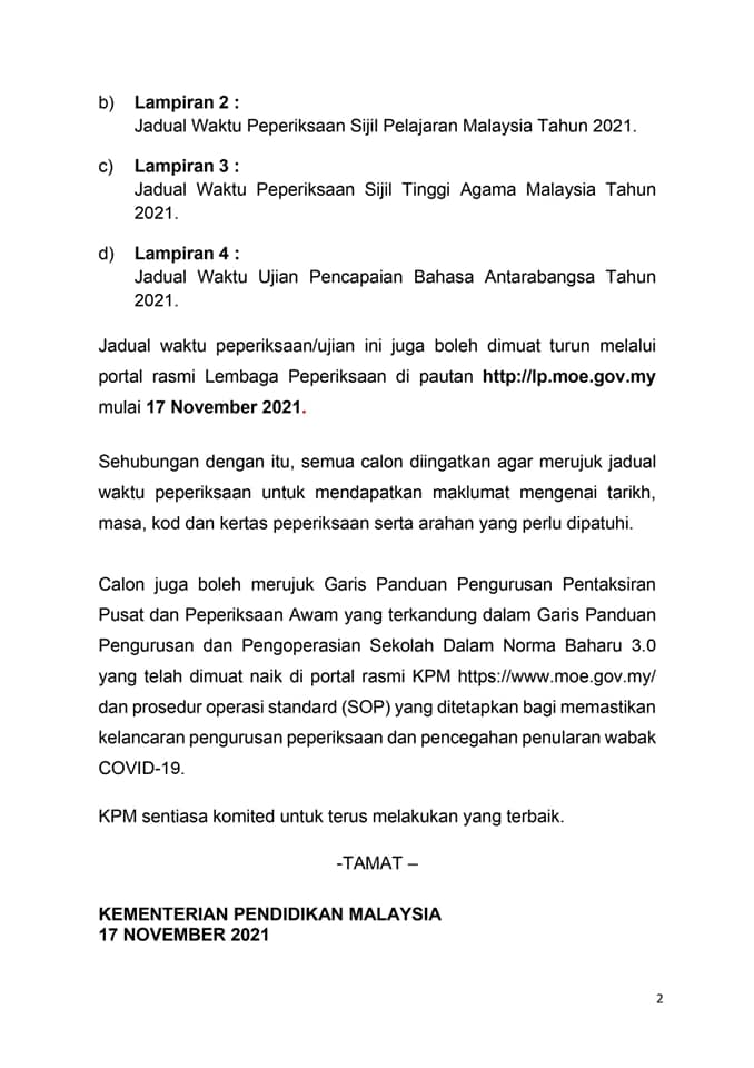 Jadual waktu peperiksaan/ujian ini juga boleh dimuat turun melalui portal rasmi Lembaga Peperiksaan di pautan http://lp.moe.gov.my mulai 17 November 2021.