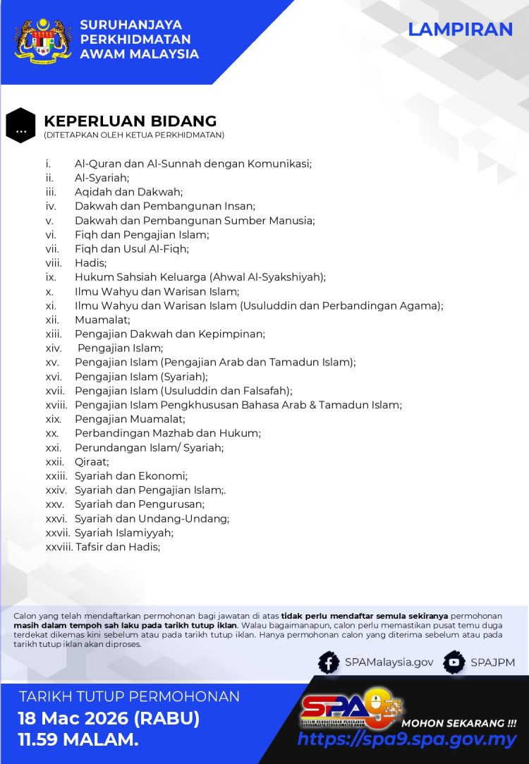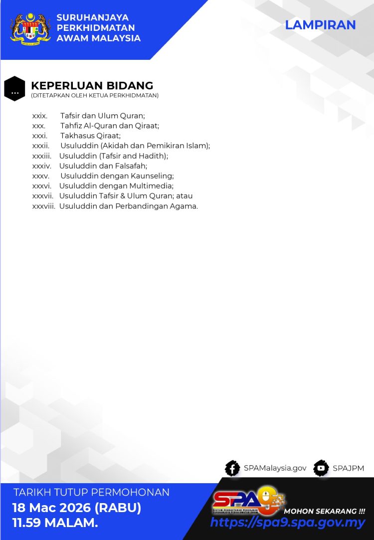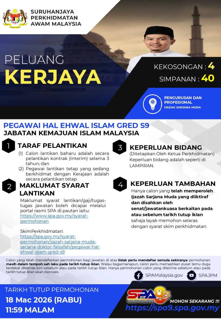 Bagi calon yang memiliki Ijazah Sarjana Muda dalam bidang pengajian Islam, ini merupakan peluang untuk menyertai perkhidmatan awam dalam kumpulan Pengurusan dan Profesional. Permohonan boleh dibuat melalui sistem SPA9 sebelum tarikh tutup yang ditetapkan.