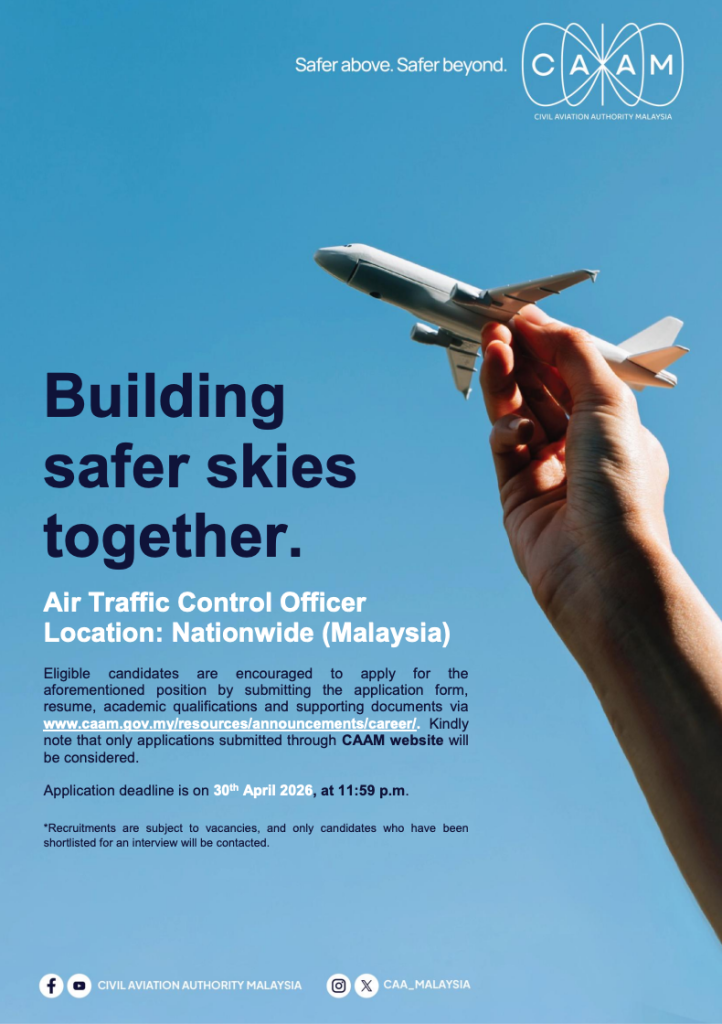 Civil Aviation Authority of Malaysia (CAAM) kini membuka permohonan jawatan Air Traffic Control Officer (ATCO) kepada warganegara Malaysia yang berkelayakan. Ini merupakan peluang kerjaya yang sangat eksklusif dalam industri penerbangan negara.